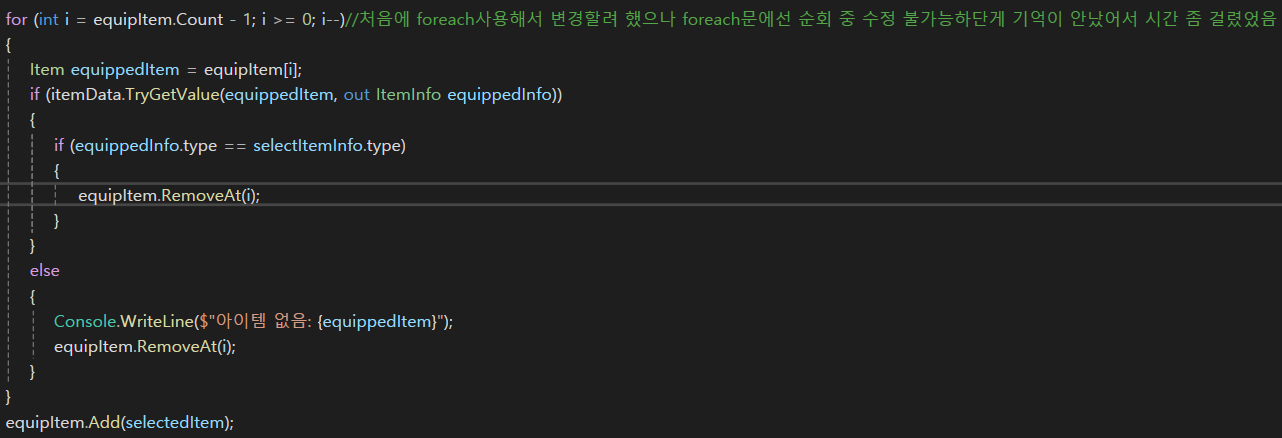 - List<Item>에서 RemoveAt()을 사용하려고 했으나 foreach문에서는 컬렉션 구조 변경이 불가능하다는 것을 다시 깨달음.