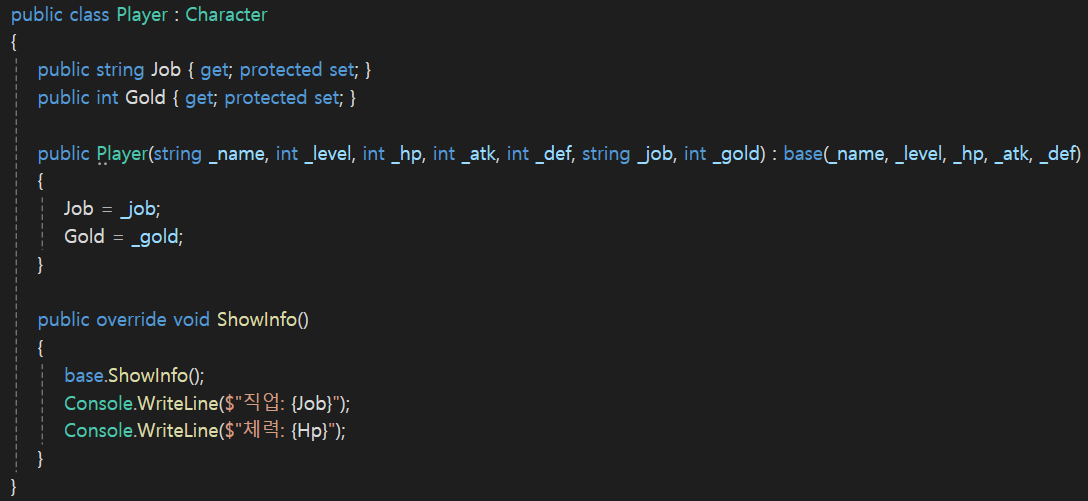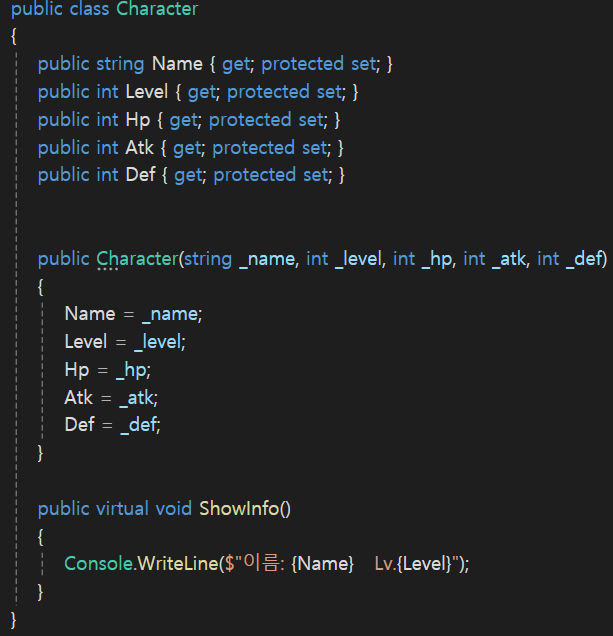 - CharacterClass에 virtual ShowInfo 메서드를 만들고, Player에서 override로 구현했음.